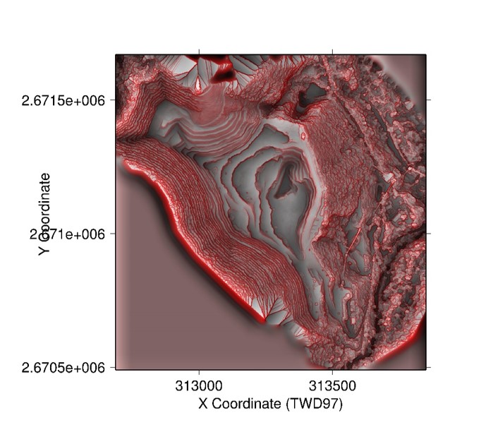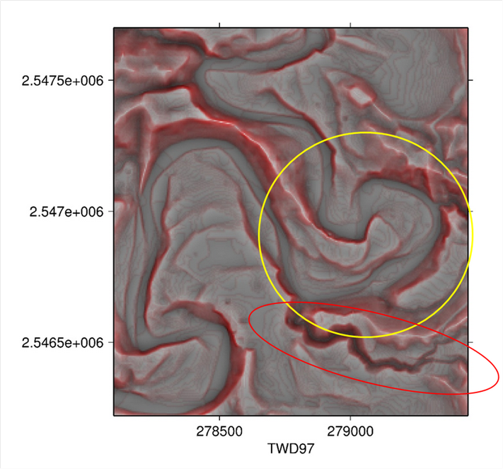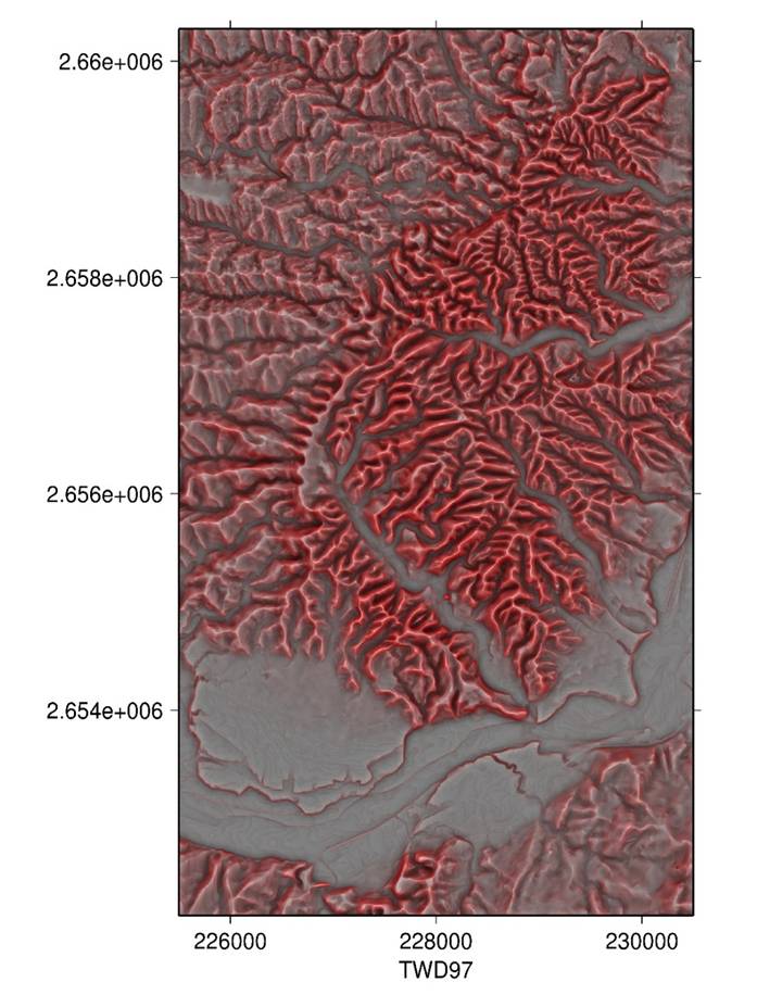 火炎山為惡地地形,其沖蝕溝非常明顯但因受光照陰影影響,所以光學影像較易誤判地形。 經由H.O.S.T.可輕易判別沖蝕溝、山脊線和山谷線。 圖片範例也顯示 H.O.S.T.可依需求有其他顏色展示或3D模式。 Haoyuan mountain is badland, the erosion ditch is very obvious, but due to the influence of light shadows, so the photo image is more likely to misjudge the terrain. Use of H.O.S.T. eroded ditch, mountain ridges and valleys can easily be identified. Example also shows that H.O.S.T. comes with various color displays or 3D modes on demand.